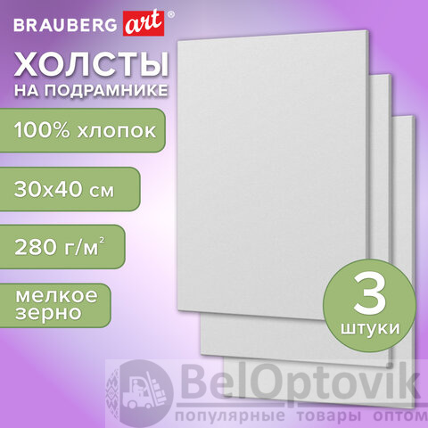 Холсты на подрамнике, набор 3 штуки, BRAUBERG ART BASIC, 30х40 см, 280 г/м2, хлопок, грунт, 192677