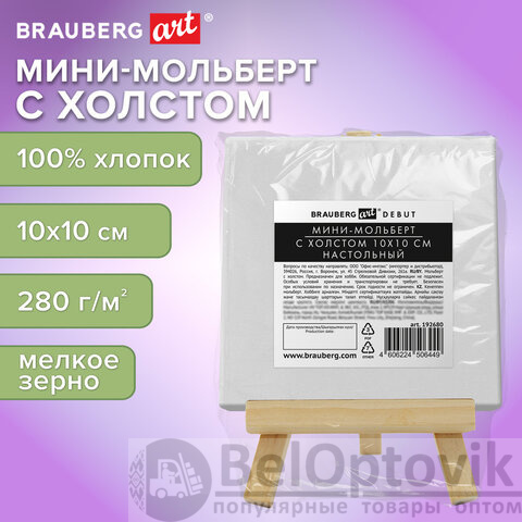 Настольный мини-мольберт с холстом 10х10 см, BRAUBERG ART DEBUT, сосна, хлопок, 192680