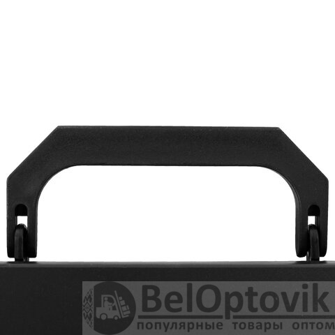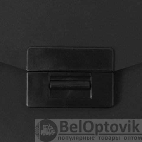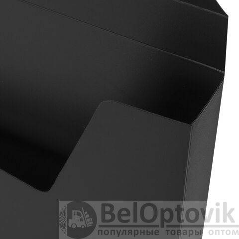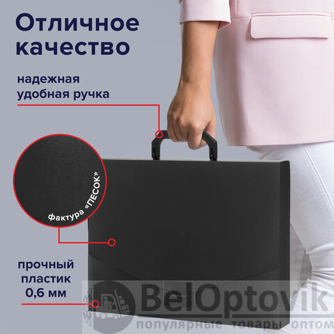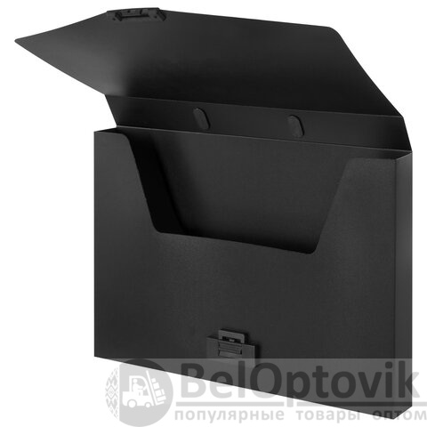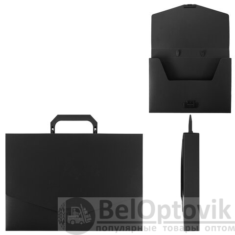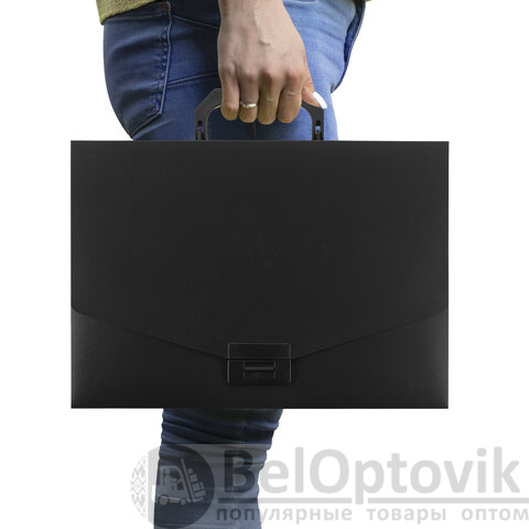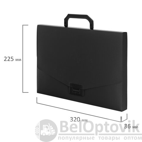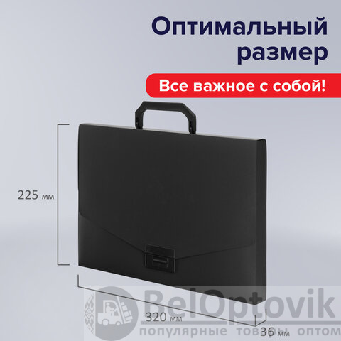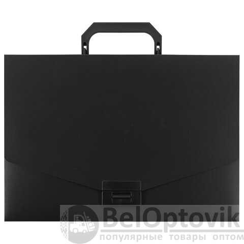 Портфель формата А4 (320х225х36 мм) изготовлен из пластика толщиной 0,6 мм, выполнен в черном цвете с фактурой "песок". Складная ручка обеспечивает компактность изделия. Портфель застегивается на клапан. Края окантованы тканью с металлическими рейками по краям окантовки, что придает изделию презентабельный вид.