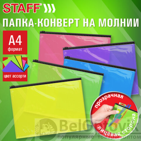 Папка-конверт на молнии А4 (230х333 мм), ПВХ, цвет ассорти/прозрачная, 0,15 мм, STAFF, 274076