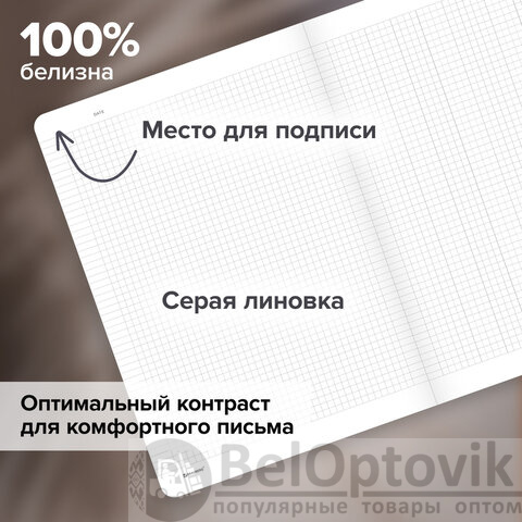 Внутренний блок содержит 96 листов офсетной бумаги плотностью 60 г/м2. Обложка изготовлена из мелованного картона повышенной плотности 300 г/м2 со специальной матовой ламинацией, устойчивой к царапинам и потертостям. Линовка блока – клетка с полями, выполненная в сером цвете для комфортного письма. Сшивка надежно соединяет листы между собой. Корешок тетради проклеен плотным материалом, дополняющим дизайн. Белизна блока – 100%. Формат листов – А5.
