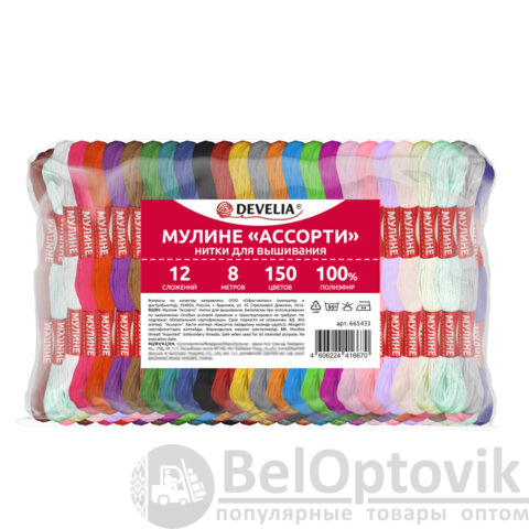 Набор ниток мулине DEVELIA представляет собой меганабор из 150 мотков ниток самых разнообразных цветов в 12 сложений в намотке по 8 метров. Это самый большой набор ниток мулине в ассортименте бренда DEVELIA. Поставляются в прозрачном полипропиленовом пакете.