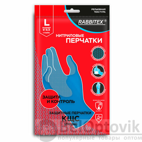 Перчатки нитриловые КЩС STRONG химически устойчивые, синие, размер 9-9,5, L (большой), RABBITEX (РАББИТЕКС), 700908