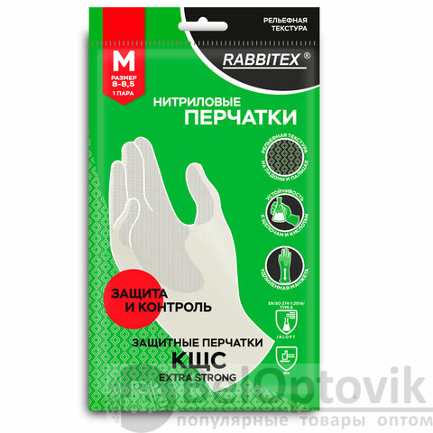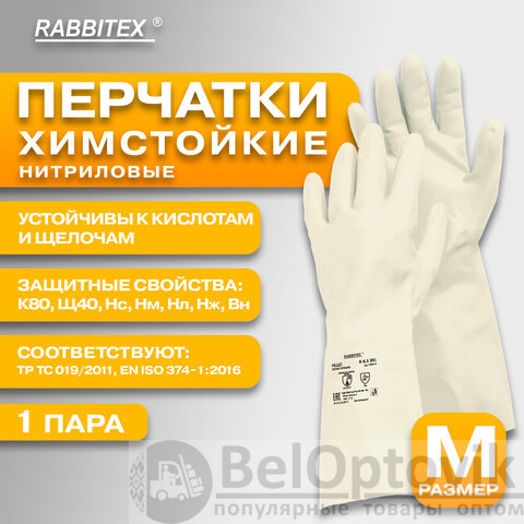 Перчатки нитриловые КЩС EXTRA STRONG химически устойчивые, белые, размер 8-8,5, M (средний), RABBITEX (РАББИТЕКС), 700915