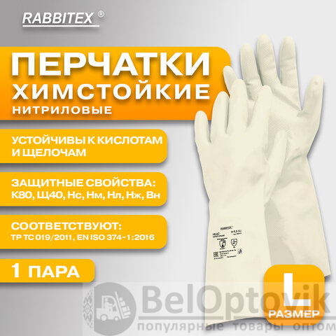 Перчатки нитриловые КЩС EXTRA STRONG химически устойчивые, белые, размер 9-9,5, L (большой), RABBITEX (РАББИТЕКС), 700916