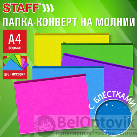 Папка-конверт на молнии А4 (230х333 мм), ПВХ, цвет ассорти с блестками, 0,15 мм, STAFF, 274079