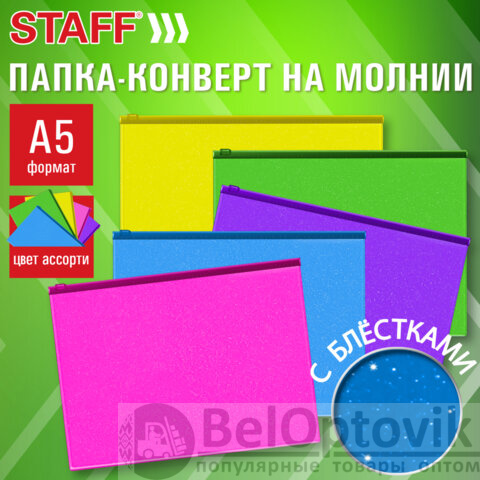 Папка-конверт на молнии МАЛОГО ФОРМАТА (180х250 мм) А5, цвет ассорти с блестками, 0,15 мм, STAFF, 274080