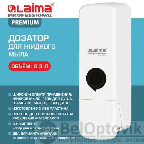 Дозатор для жидкого мыла LAIMA PREMIUM НАЛИВНОЙ, 0,3 л, белый, ABS-пластик, 609498