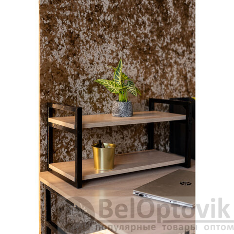 Боковины изготовлены из профильной стальной трубы 20х10 мм, покрытые порошковой полимерной краской, цвет – черный муар. Полки – ЛДСП, цвет – ясень шимо светлый.