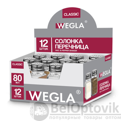 Солонки-перечницы WEGLA поставляются в фирменной дисплей-упаковке по 12 штук, которая готова к размещению на полке магазина.