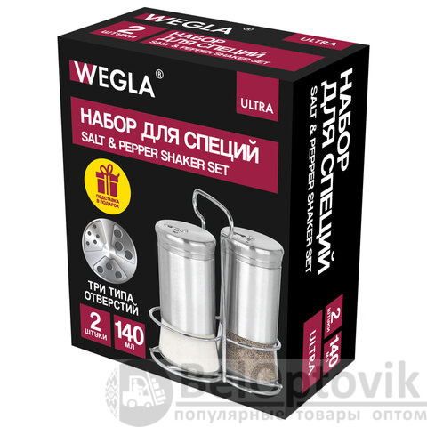 Набор для специй 2х140 мл, ULTRA, подставка + солонка + перечница, 3 типа отверстий, WEGLA (ВЕГЛА), 700234