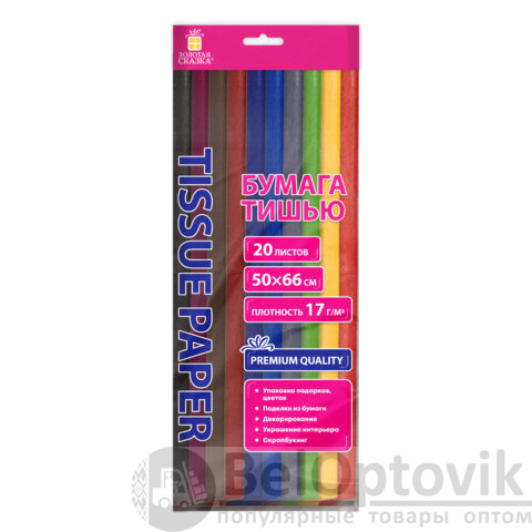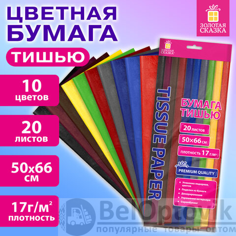 Цветная бумага ТИШЬЮ 17 г/м2, 50х66 см, 20 листов, 10 цветов, интенсив ассорти, ЗОЛОТАЯ СКАЗКА, 116494