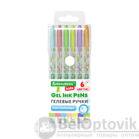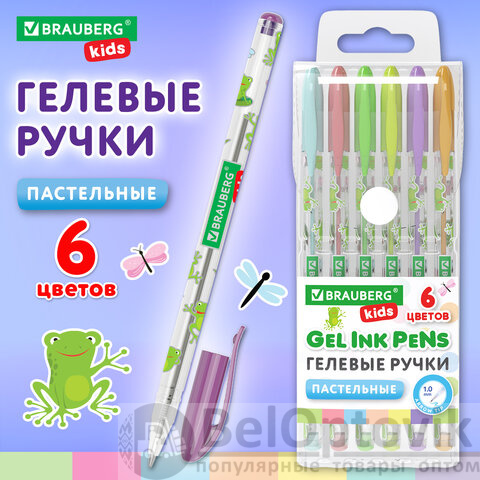 Ручки гелевые ПАСТЕЛЬНЫЕ BRAUBERG KIDS "CUTE ANIMALS", НАБОР 6 ЦВЕТОВ, корпус с печатью, узел 1 мм, линия письма 0,7 мм, 144439