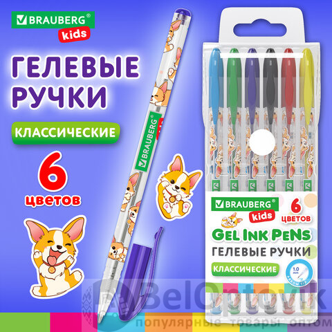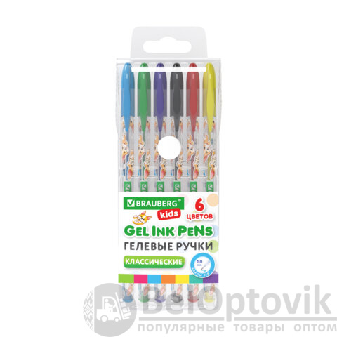 Ручки гелевые КЛАССИЧЕСКИЕ BRAUBERG KIDS "CUTE ANIMALS", НАБОР 6 ЦВЕТОВ, корпус с печатью, узел 1 мм, линия письма 0,7 мм, 144441