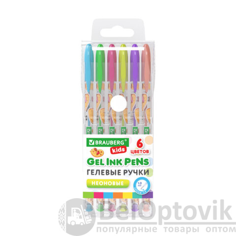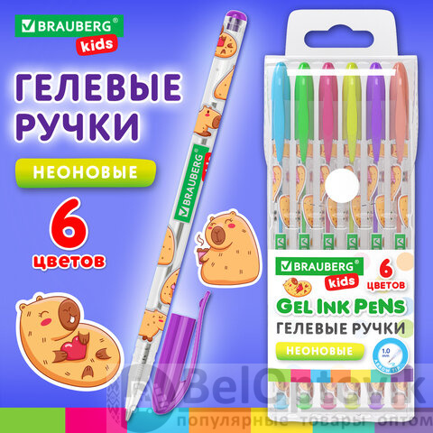 Ручки гелевые НЕОНОВЫЕ BRAUBERG KIDS "CUTE ANIMALS", НАБОР 6 ЦВЕТОВ, корпус с печатью, узел 1 мм, линия письма 0,7 мм, 144442