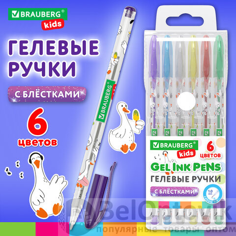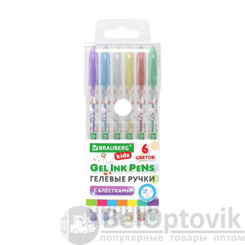 Ручки гелевые С БЛЕСТКАМИ BRAUBERG KIDS "CUTE ANIMALS", НАБОР 6 ЦВЕТОВ, корпус с печатью, узел 1 мм, линия письма 0,7 мм, 144443