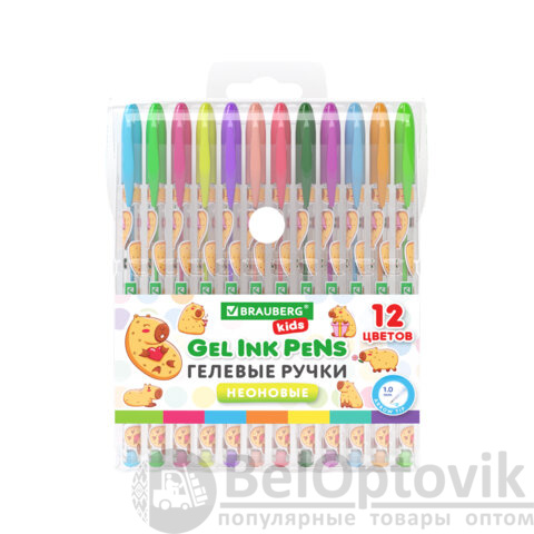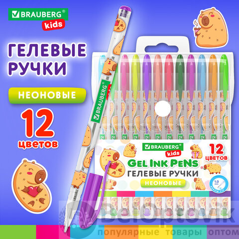 Ручки гелевые НЕОНОВЫЕ BRAUBERG KIDS "CUTE ANIMALS", НАБОР 12 ЦВЕТОВ, корпус с печатью, узел 1 мм, линия письма 0,7 мм, 144444