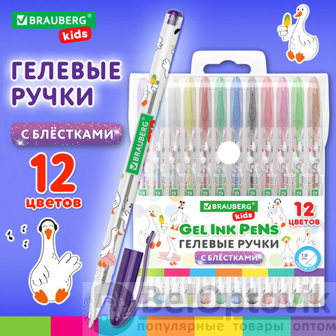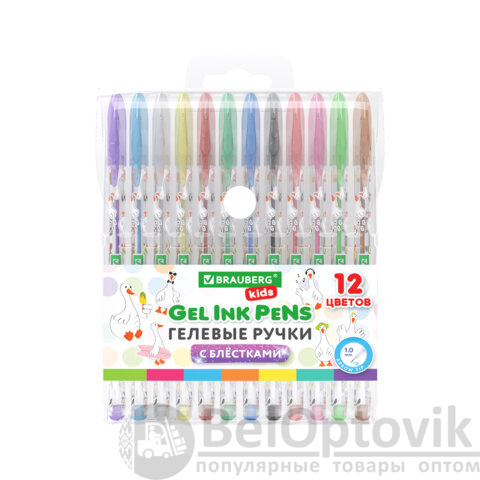 Ручки гелевые С БЛЕСТКАМИ BRAUBERG KIDS "CUTE ANIMALS", НАБОР 12 ЦВЕТОВ, корпус с печатью, узел 1 мм, линия письма 0,7 мм, 144446
