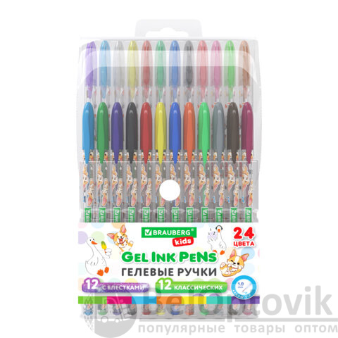 Ручки гелевые BRAUBERG KIDS "CUTE ANIMALS", НАБОР 24 ЦВЕТА, корпус с печатью, узел 1 мм, линия письма 0,7 мм, 144447