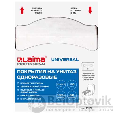 Универсальный размер. Сочетаются с диспенсерами других производителей. Предназначены для одноразового использования. Подходят к унитазам любой формы. Изготовлены из 100% целлюлозы белого цвета. Тип сложения – 1/4. В упаковке 100 покрытий для унитаза. Размер листа – 37х42,5 см.