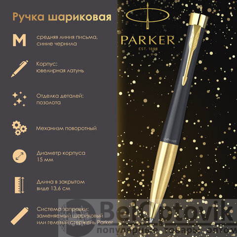 Корпус ручки PARKER "Urban Muted Black GT" изготовлен из латуни покрытой лаком. Элементы отделки выполнены из нержавеющей стали и покрыты позолотой.
