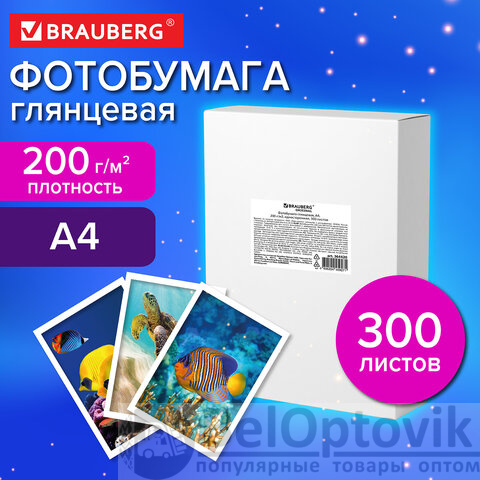 Фотобумага глянцевая, А4, 200 г/м2, односторонняя, 300 листов, BRAUBERG ORIGINAL, 364420