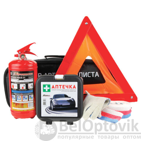 Набор автомобилиста АВТО: аптечка МИРАЛ, огнетушитель ОП-2, знак аварийный, трос, перчатки, шк 7244, 46442