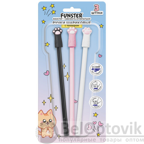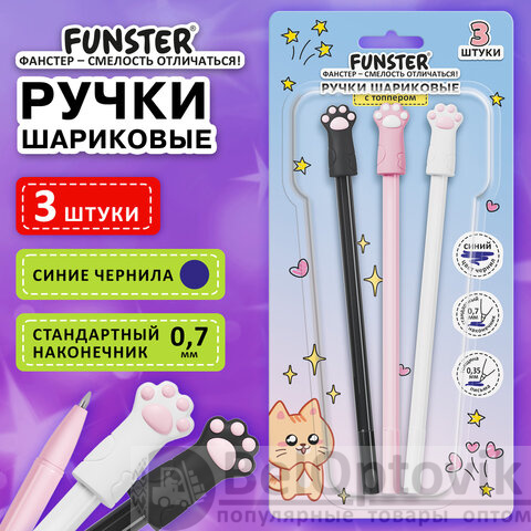 Ручки с топпером шариковые FUNSTER (ФАНСТЕР) "CAT PAWS", НАБОР 3 ШТУКИ, СИНИЕ, пишущий узел 0,7 мм, линия письма 0,35 мм, 144375