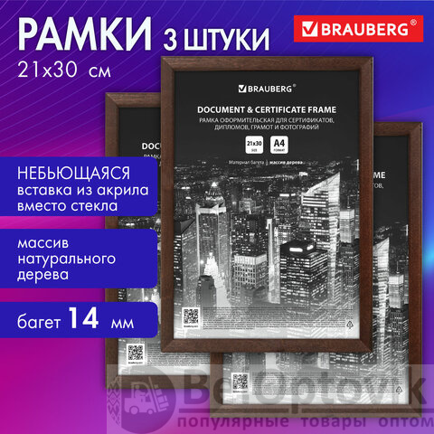 Рамка 21х30 см небьющаяся, КОМПЛЕКТ 3 шт., багет 14 мм дерево, BRAUBERG "Elegant", цвет венге, 391356