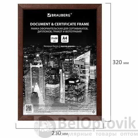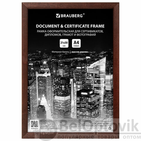 Рамки стандартного формата А4 (21х30 см) выполнены из дерева цвета "венге", за счет чего отлично впишутся в домашний и деловой интерьер. У каждой рамки имеется возможность вертикального и горизонтального подвеса.