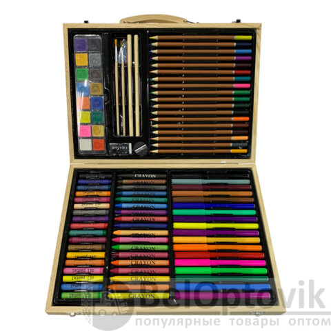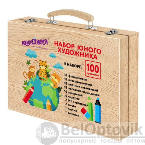 Набор представляет собой кейс с красочным дизайном и грамотно подобранным наполнением из 100 предметов. Кейс раскладывается как книга. Каждый предмет надежно закреплен в ячейке. Надежный корпус кейса гарантирует полную защиту внутреннего наполнения от повреждений. Набор надежно упакован в термоусадку и короб из гофрокартона. Углы кейса дополнительно защищены от повреждений при транспортировке. Набор удобно брать с собой в школу или в поездку.