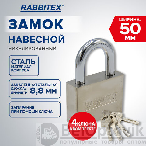 Замок навесной стальной 50 мм "Никель", антикоррозионное покрытие, 4 ключа, RABBITEX (РАББИТЕКС), 671309
