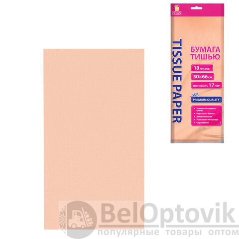 Набор бумаги персикового цвета состоит из 10 листов формата 50х66 см и имеет плотность 17 г/м2. Бумага упакована в пакет с отверстием для подвешивания. Если вы творческий человек и увлекаетесь поделками из бумаги тишью, то благодаря данному отверстию вы можете организовать хранение бумаги в наглядном, доступном месте, подвесив ее над своим рабочим местом. Ваши творческие идеи оживут от одного прикосновения к этой бумаге! Она позволит вам раскрыться в полной мере, как дизайнеру, при оформлении подарков на свадьбы, дни рождения, памятные даты!