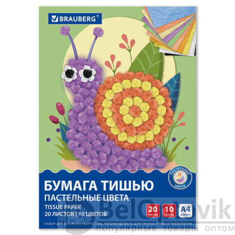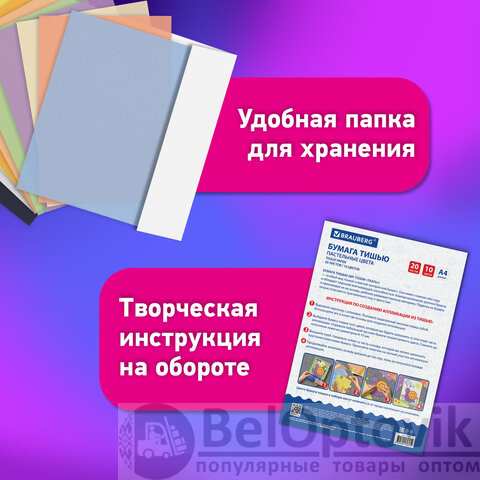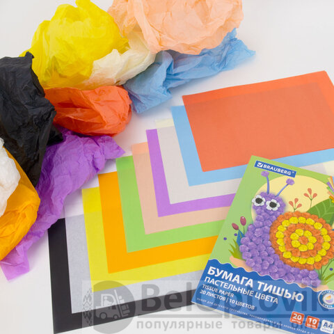 Цветная бумага ТИШЬЮ 17 г/м2, А4 (210х297 мм), 20 листов, 10 цветов пастель, в папке, BRAUBERG, 116497