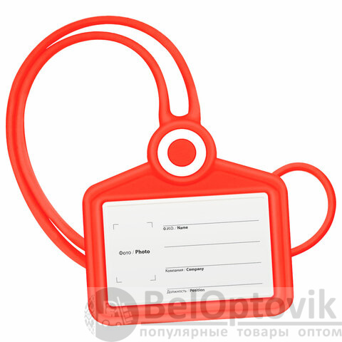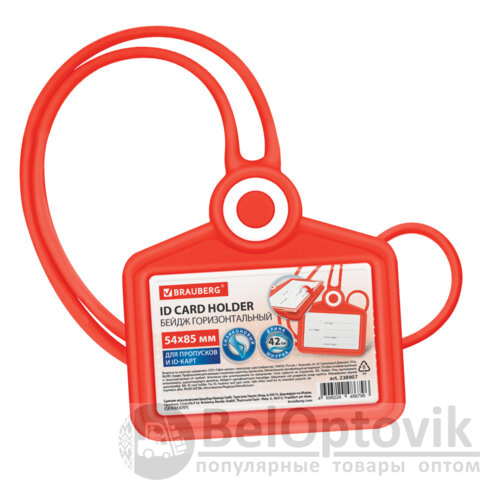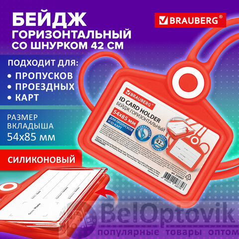 Бейдж горизонтальный для пропуска и ID-карт, СИЛИКОНОВЫЙ, 54х85 мм, шнурок 42 см, красный BRAUBERG, 238907