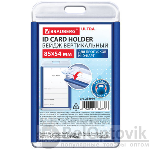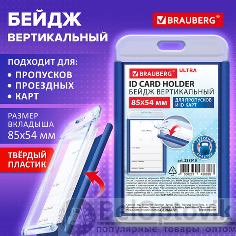 Вертикальный бейдж BRAUBERG ULTRA для хранения пропусков и карточек сотрудников, ID-карт, проездных и банковских карт.