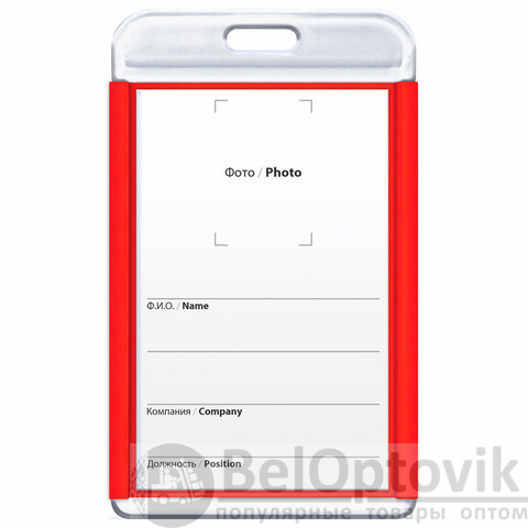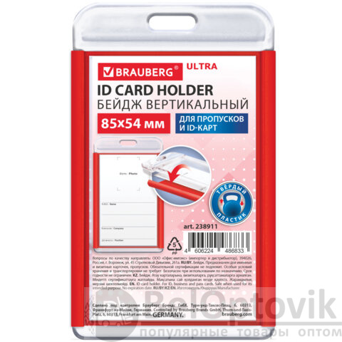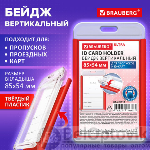 Бейдж вертикальный для пропуска и ID-карт, 85х54 мм, красный, BRAUBERG ULTRA, 238911