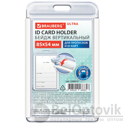 Вертикальный бейдж BRAUBERG ULTRA для хранения пропусков и карточек сотрудников, ID-карт, проездных и банковских карт.
