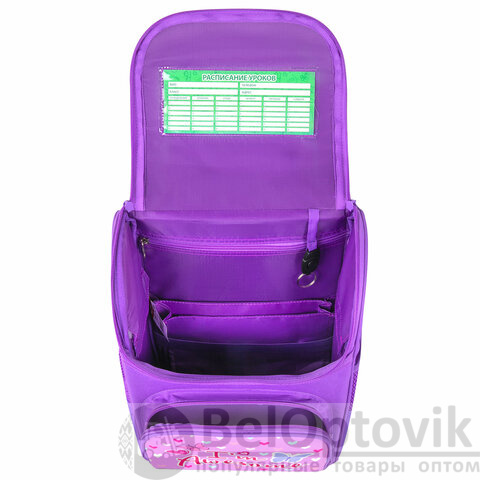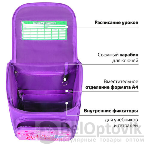 В основном отделении ранца можно легко и быстро разместить учебники и тетради, а также воспользоваться прижимными перегородками на резинке. Внутри ранца имеется карабин для ключей и вкладыш для заполнения расписания уроков на внутренней стенке крышки ранца.