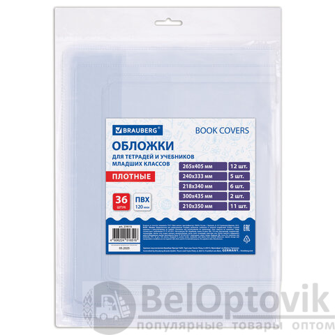 Обложки ПВХ для тетрадей и учебников младших классов, НАБОР 36 шт., ПЛОТНЫЕ, 120 мкм, универсальные, прозрачные, BRAUBERG, 274115