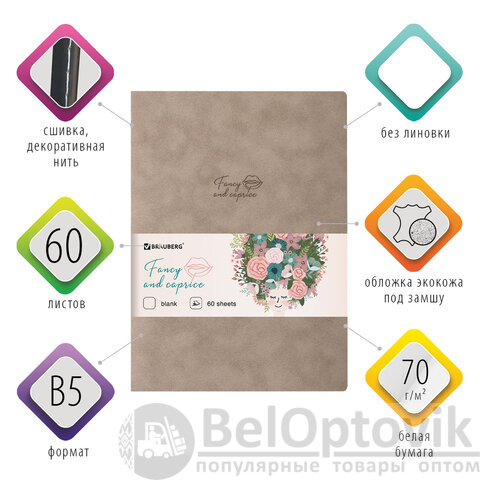 Общая тетрадь формата В5 содержит 60 листов без линовки, что позволяет не только писать, но и делать зарисовки и наброски карандашом, линером, ручкой. Сшивка плотно соединяет листы. Обложка изготовлена из высококачественной эко-кожи под замшу, что придает тетради изысканный и неповторимый стиль. Внутренний блок - белая офсетная бумага плотностью 70 г/м2.