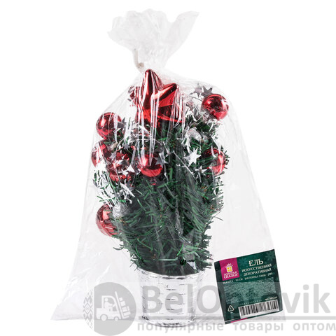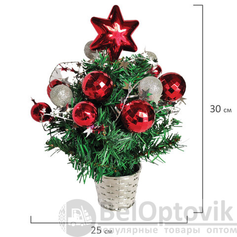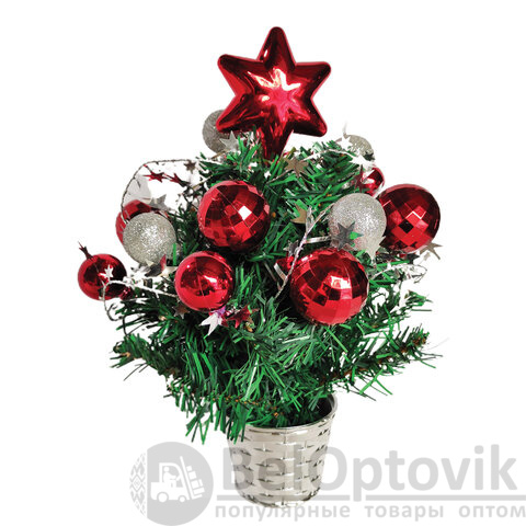 В комплект декоративной ели входят красные и серебристые украшения в форме елочных шаров, имитация серебристой гирлянды с декором в виде звезд, а также пластиковая красная звезда, закрепленная на макушке ели. Материал хвои - ПВХ. Тип крепления ветвей – примотка. Данный способ крепления предполагает, что после покупки ели необходимо самостоятельно расправить веточки для того, чтобы ель приобрела нужную форму. Высота ели - 30 см (включая подставку в форме декоративного горшка серебристого цвета), диаметр нижнего яруса - 25 см.