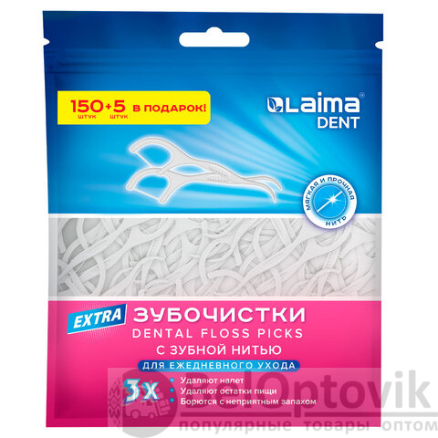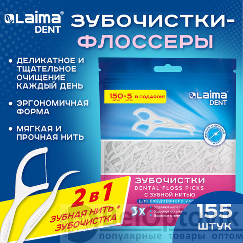 Зубочистки-флоссеры с зубной нитью "150 шт. + 5 шт. в подарок!", зиплок-пакет, LAIMA DENT, 609402