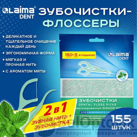 Зубочистки-флоссеры с зубной нитью "150 шт. + 5 шт. в подарок!", ВКУС МЯТЫ, зиплок-пакет, LAIMA DENT, 609403