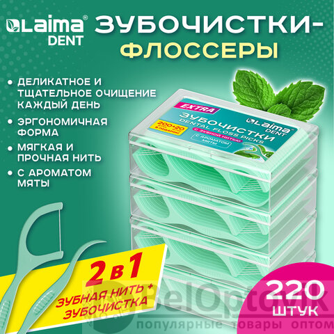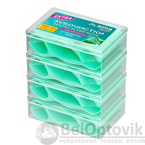 Зубочистки-флоссеры с зубной нитью "200 шт. (4х50 шт.) + 20 в подарок!", в боксе, ВКУС МЯТЫ, LAIMA DENT, 609407