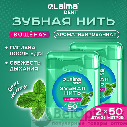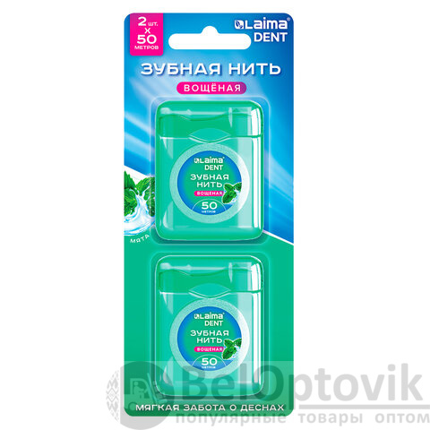 Зубная нить вощеная 100 м (2 шт. х 50 м), мягкая забота о деснах, ВКУС МЯТЫ, LAIMA DENT, 609414