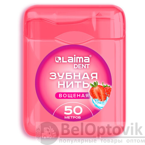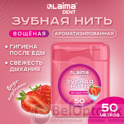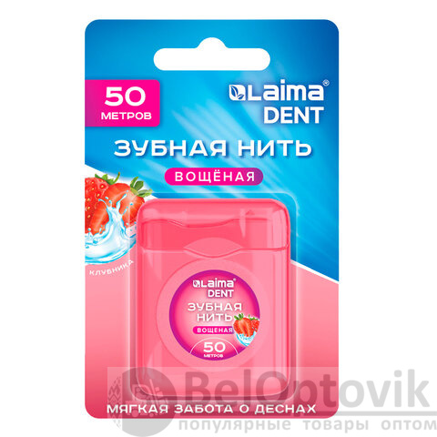 Зубная нить вощеная 50 м, мягкая забота о деснах, ВКУС КЛУБНИКИ, LAIMA DENT, 609415