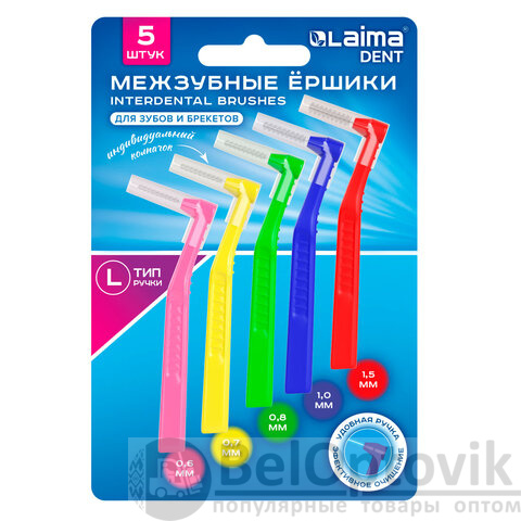 Межзубные ершики 0,6-0,7-0,8-1-1,5 мм, для зубов и брекетов, 5 шт., угловая ручка L-тип, LAIMA DENT, 609418