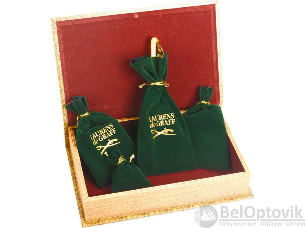 Оригинальный подарочный набор для мужчин включает в себя удобное портмоне, небольшие карманные часы на цепочке с подставкой, а также нож для бумаг. Аксессуары упакованы в индивидуальные мешочки и подарочную коробку.