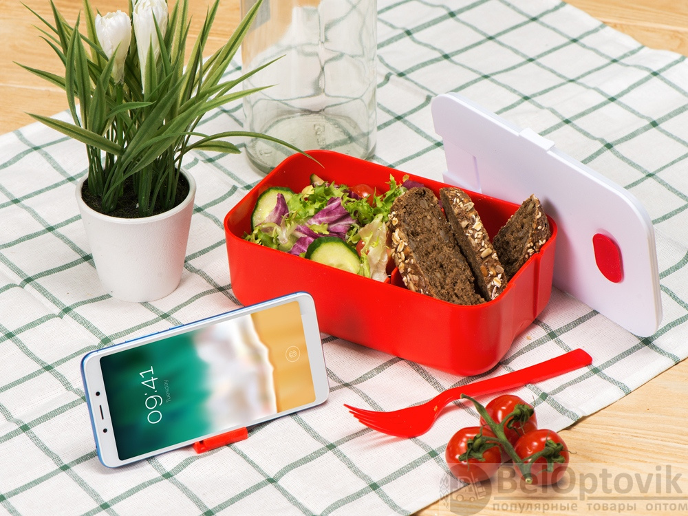 Ланч-бокс Neo можно брать с собой на работу, в школу, университет и командировки. Внутри прочной пластиковой емкости находятся снимаемая перегородка и вилка. Крышка с клапаном препятствует выпадению продуктов из бокса. Чтобы облегчить открытие контейнера, сначала выпустите воздух из него, потянув за силиконовый клапан на крышке. Деталь для фиксации крышки контейнера выполняет дополнительную функцию подставки для телефона, что особенно понравится тем, кто привык смотреть видео или читать книги во время перекуса. Ланч-бокс Neo можно разогревать в микроволновой печи, предварительно сняв крышку контейнера. Также разрешается использовать в посудомоечной машине и морозильной камере.